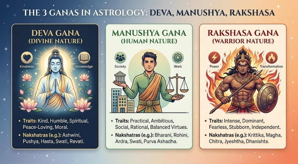 The word "Gana" simply means “group” or "category." In astrology, people are divided into three psychological and spiritual personality types. It never labels anyone as a good or bad human being. Instead, it always reflects the natural tendencies, behavioral patterns, and instinctive responses of the individual.